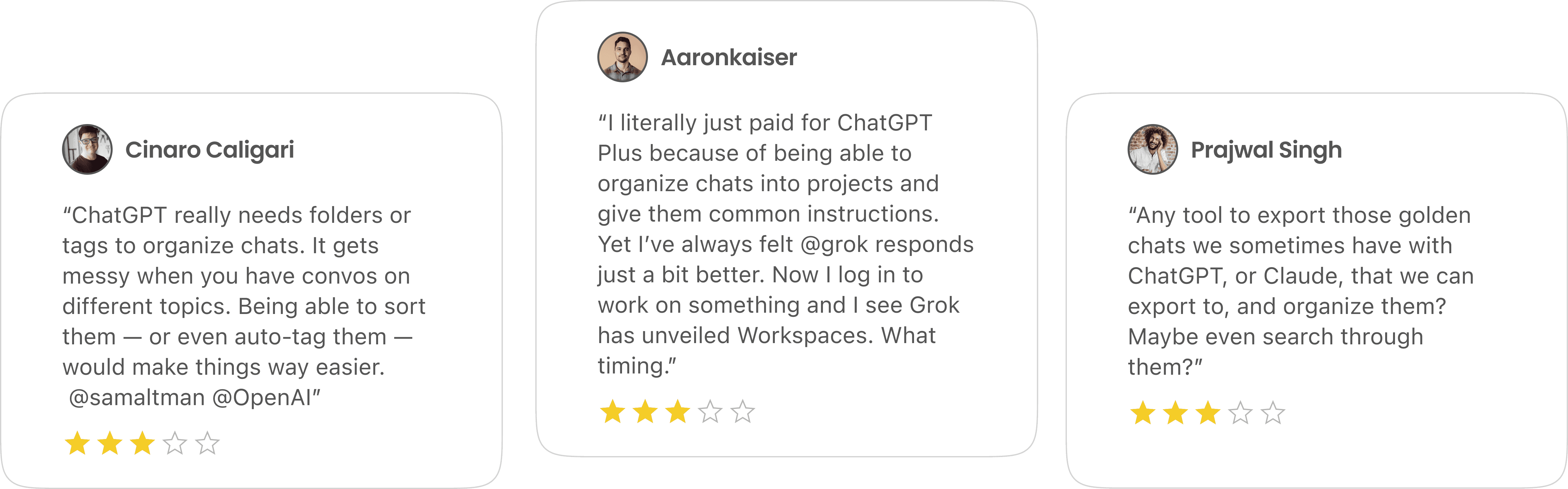 We conducted field research across platforms like Twitter, Reddit, and YouTube comments to uncover users’ biggest frustrations with chat management in ChatGPT.