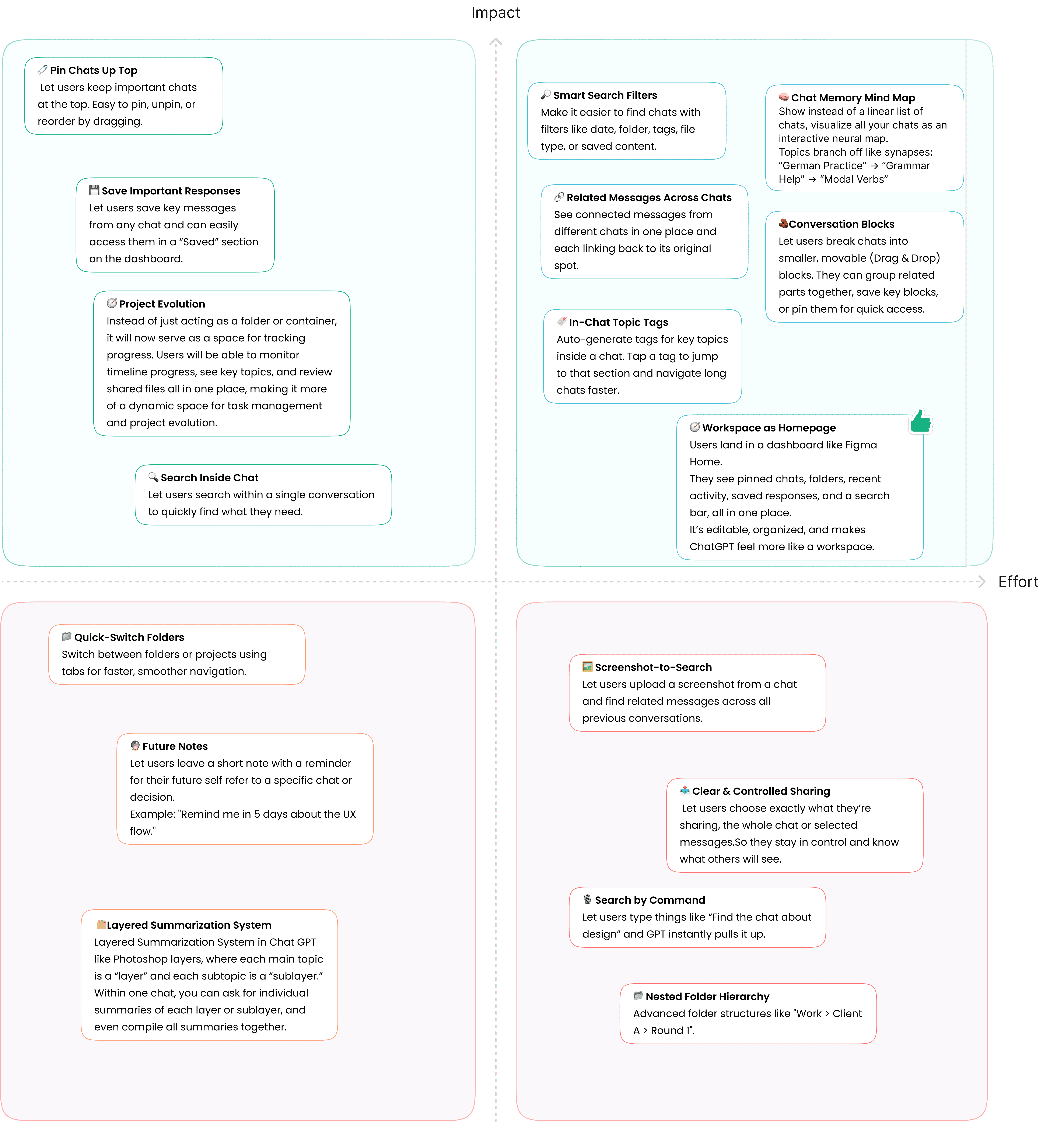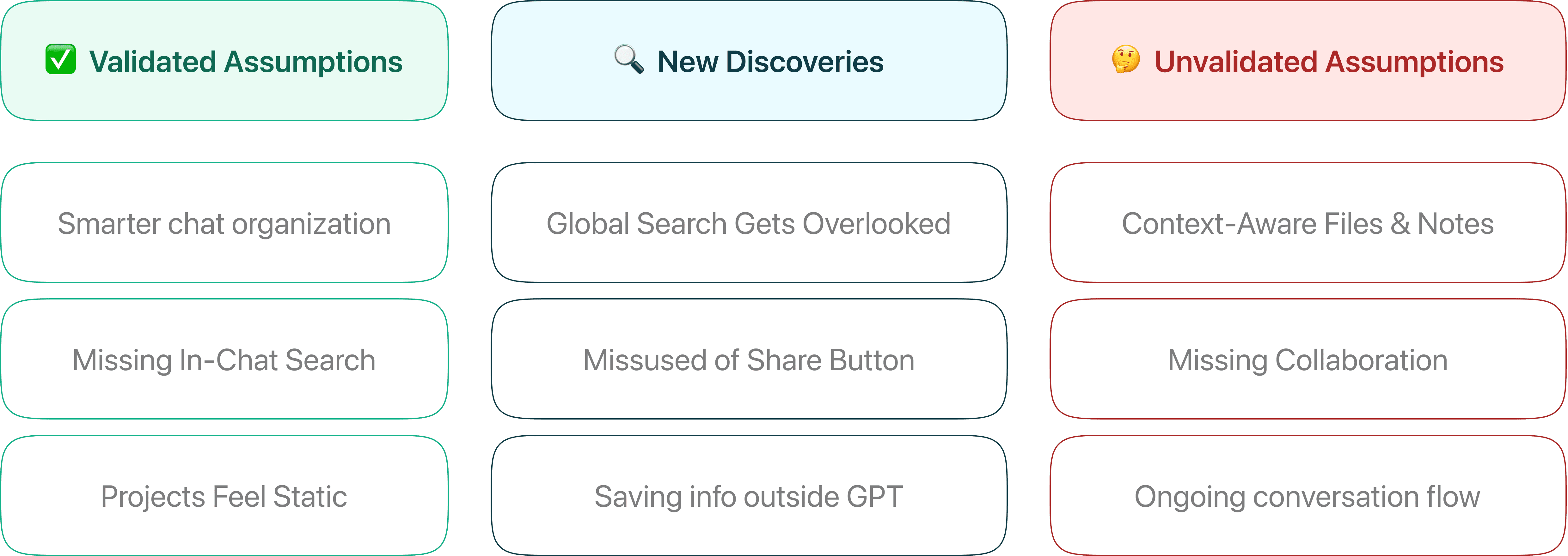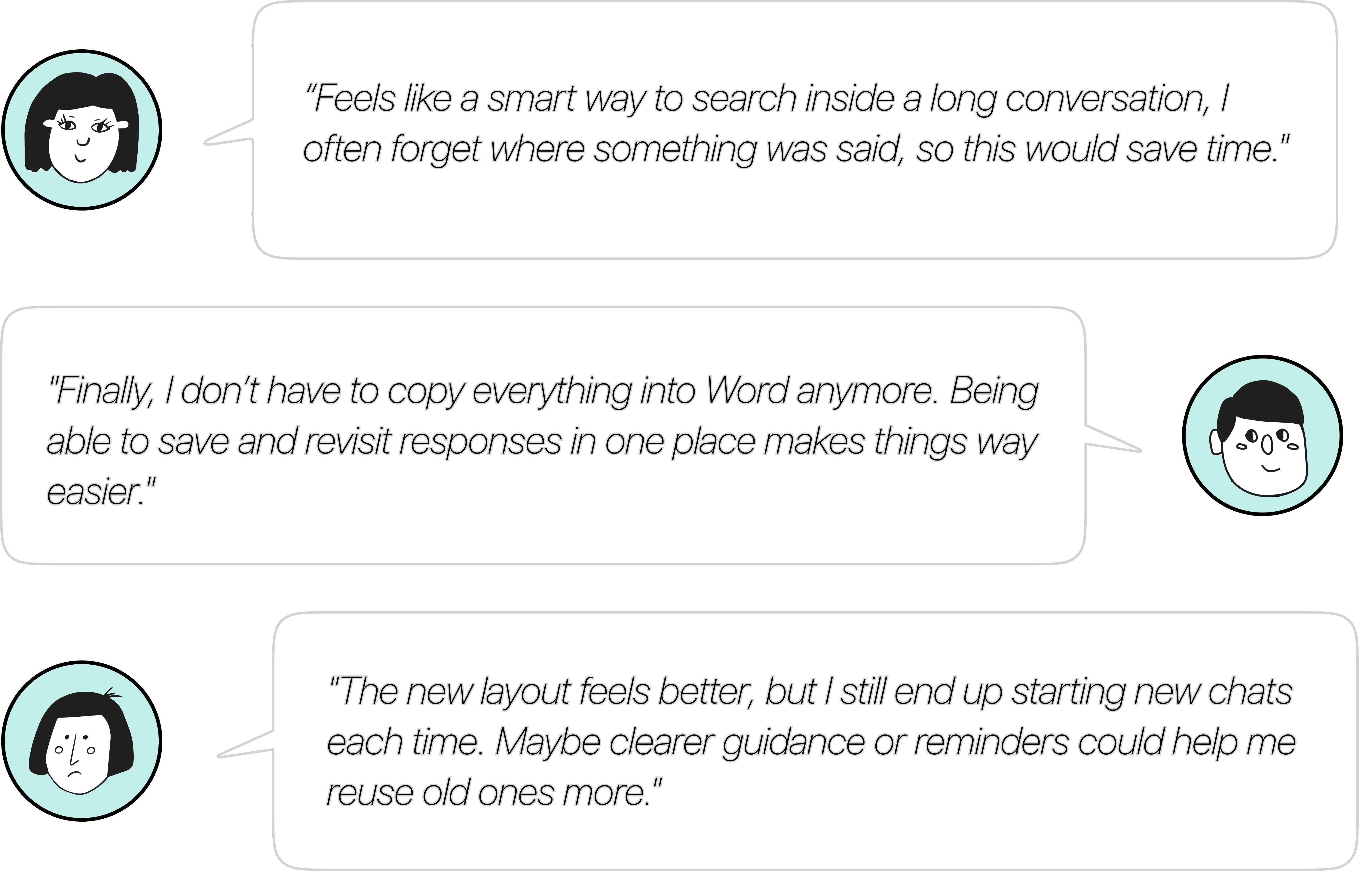 We ran interviews and contextual inquiries to see if the issues we found in online comments showed up in real use. Watching how people use ChatGPT in their daily flow helped us spot what truly gets in their way.