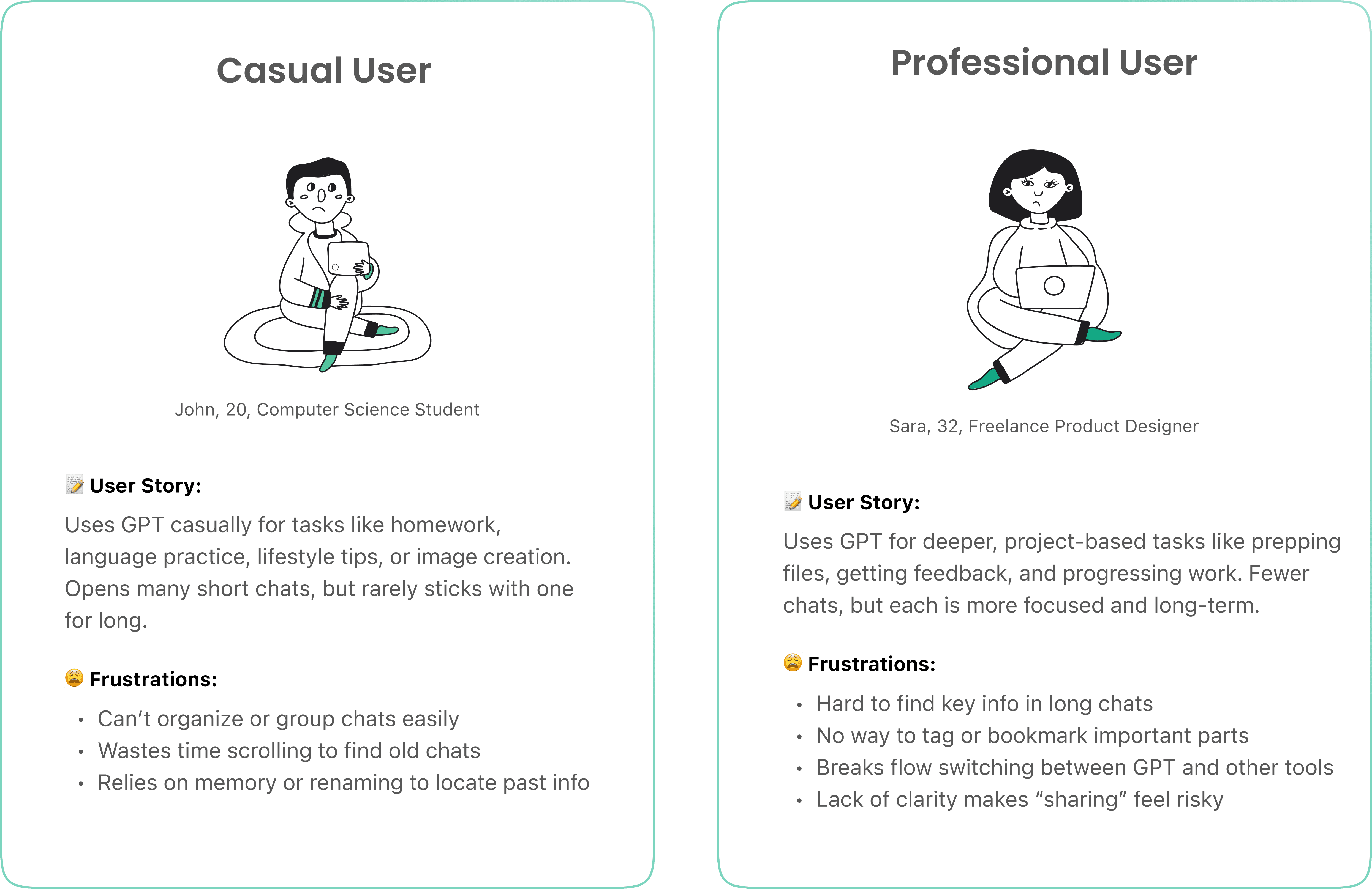 We identified two key user types, casual and professional. Each with distinct needs and friction points. By mapping their usage habits and frustrations, we uncovered patterns that shaped our design direction.