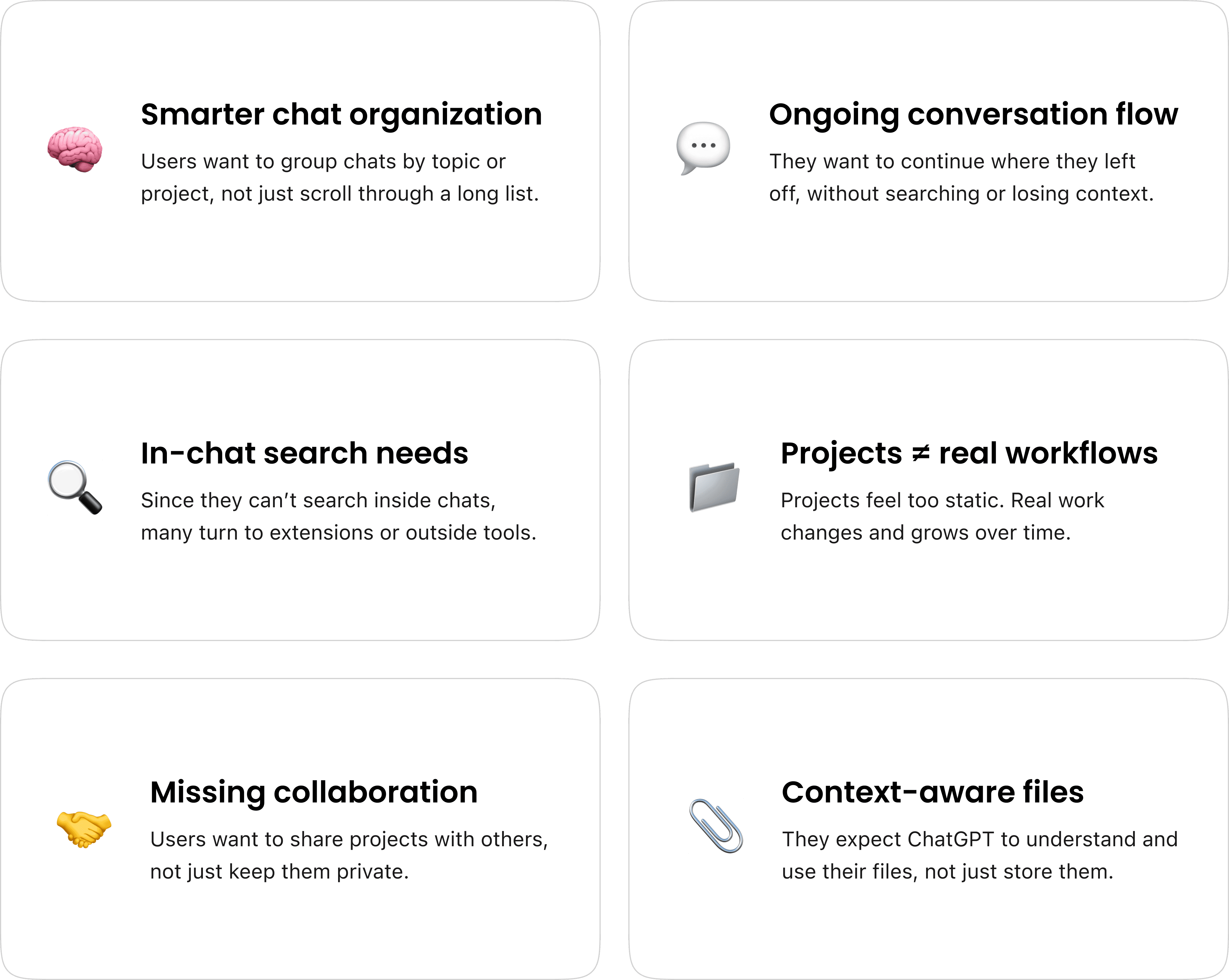 Even with the launch of Projects, users still face challenges. Whether on Reddit or Twitter, people consistently highlight gaps in how ChatGPT supports continuity, organization, and memory.