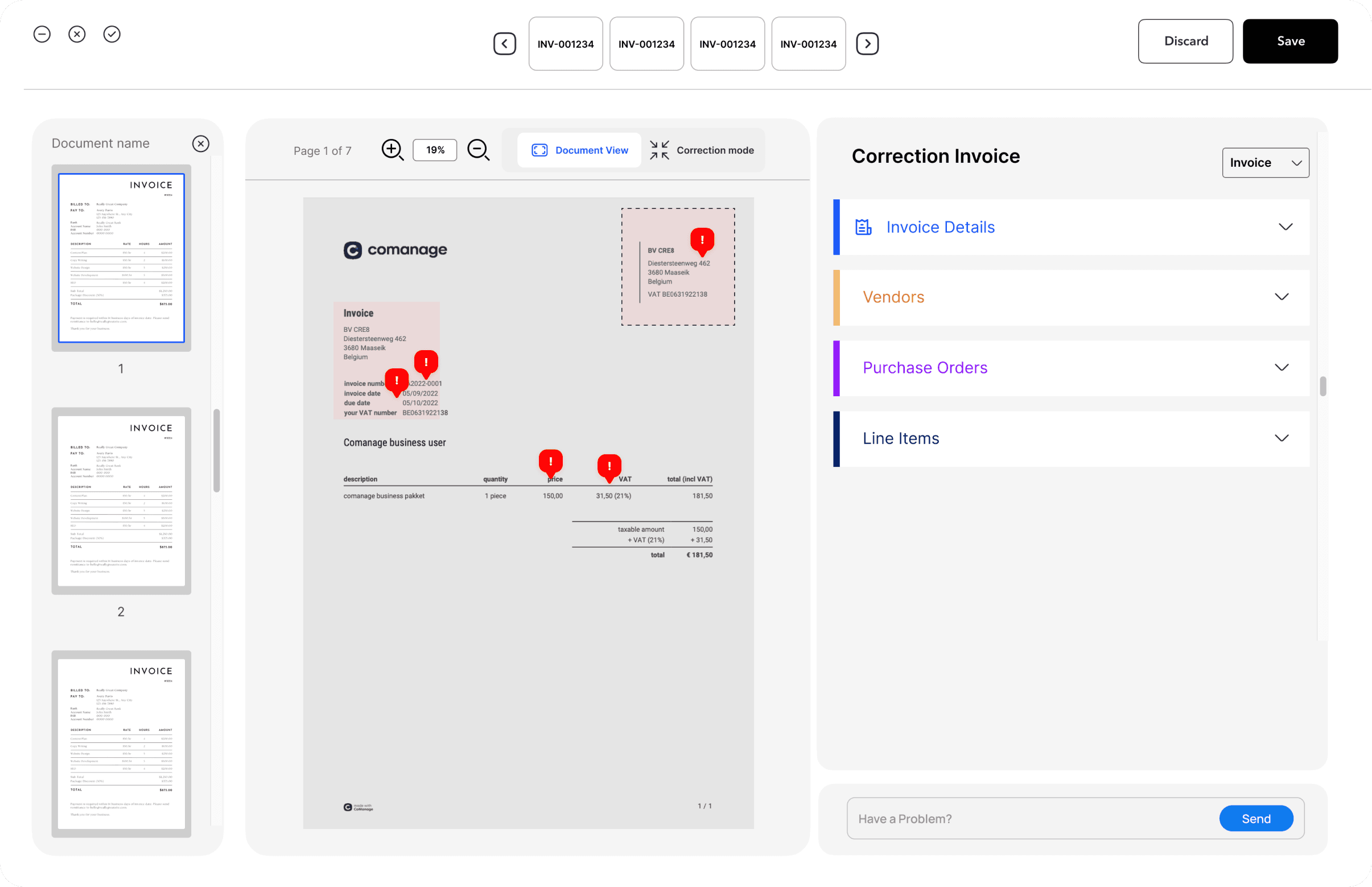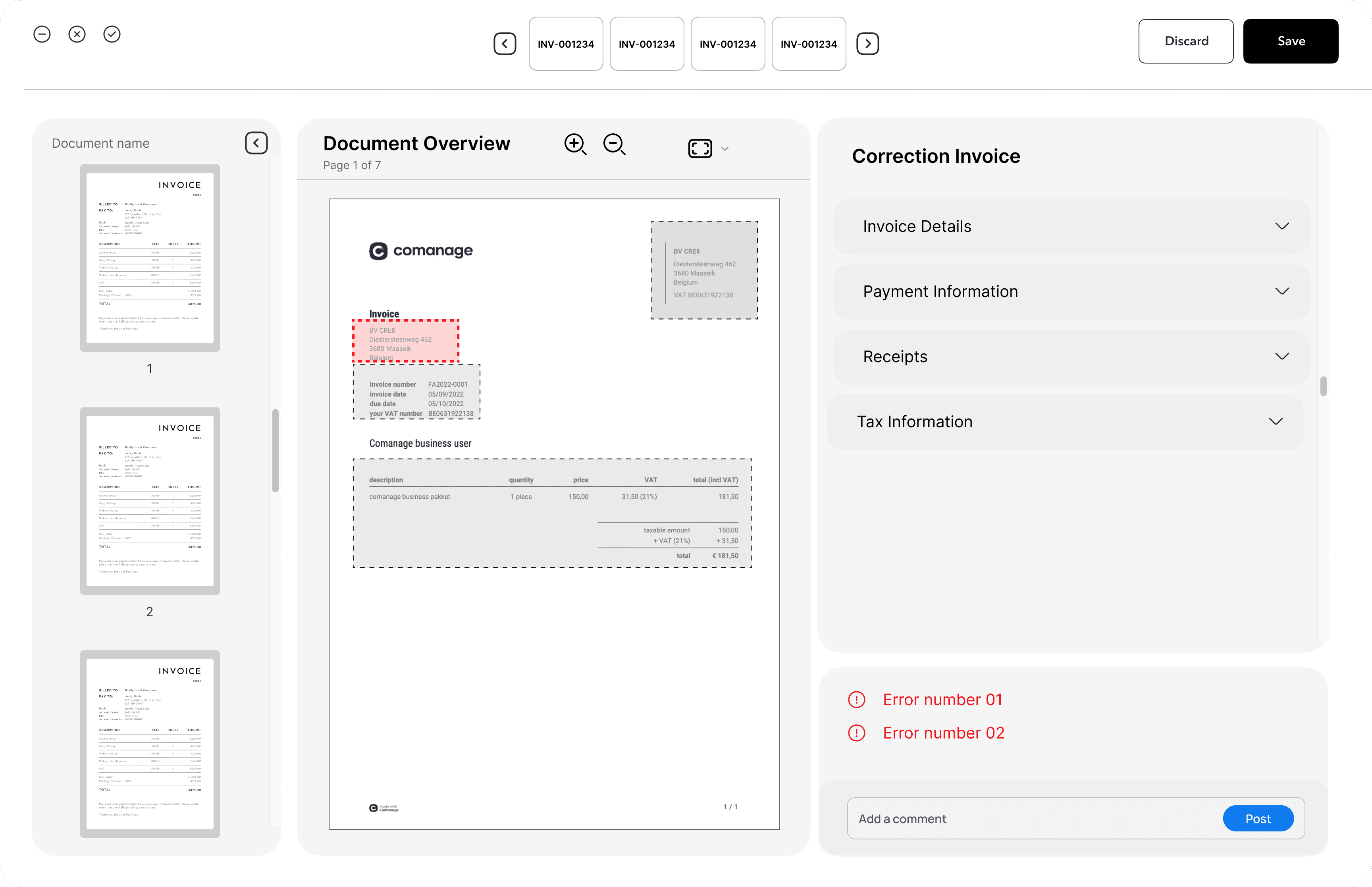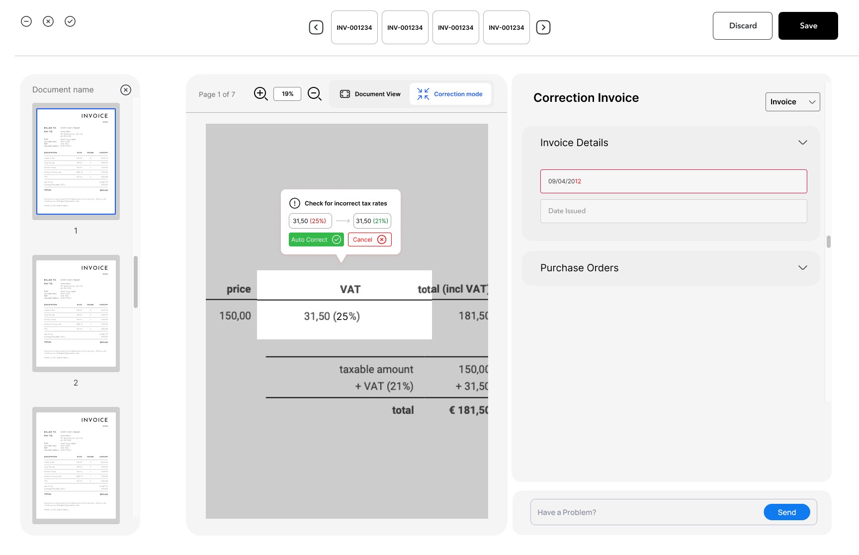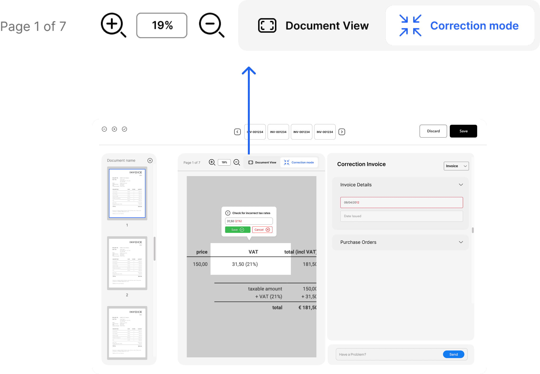 I added dedicated view controls (Correction mode and Document view) that allow the operator to instantly zoom in on specific fields. This removes the distraction of the full invoice, enabling highly focused, accurate error-checking.