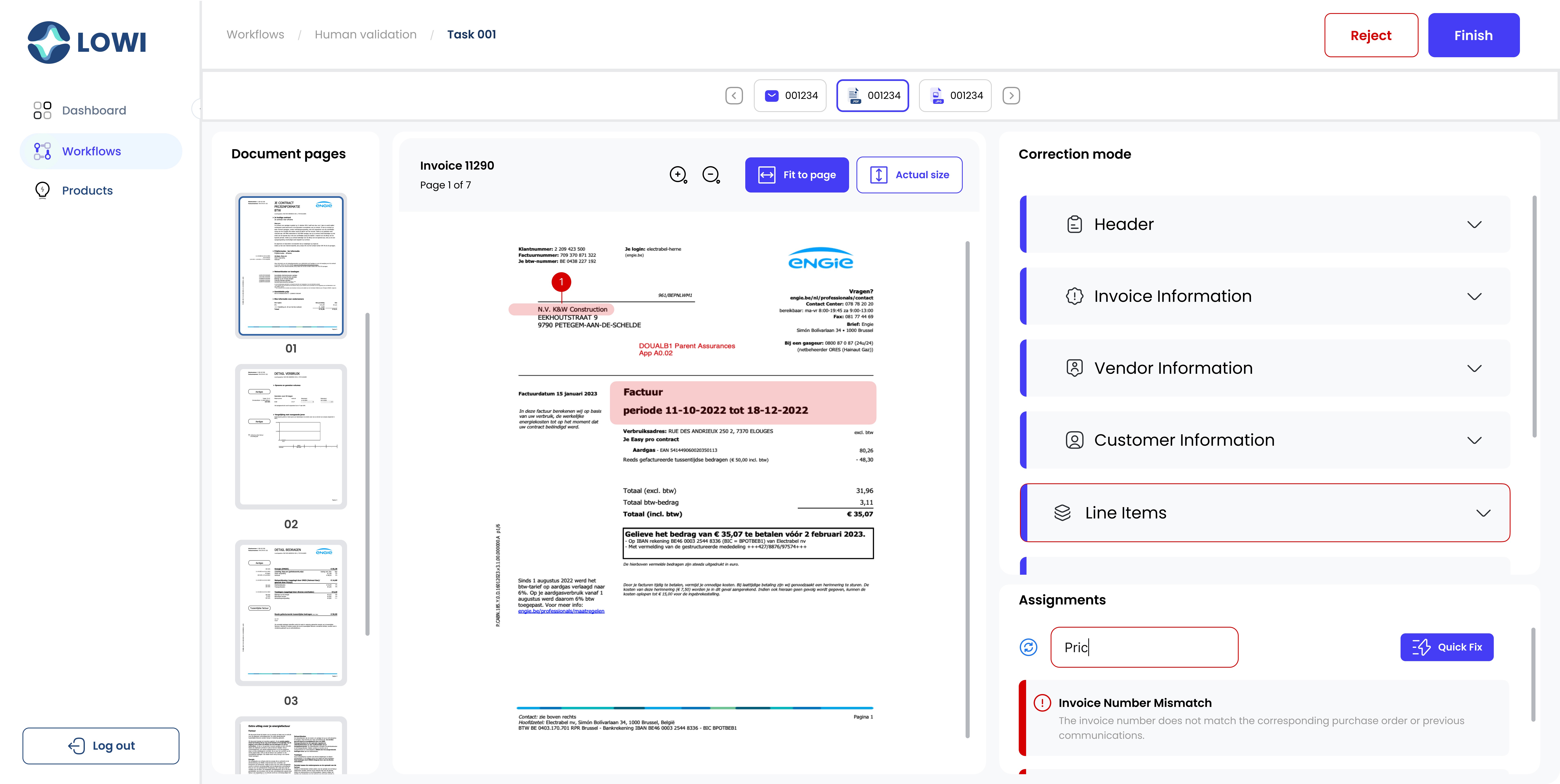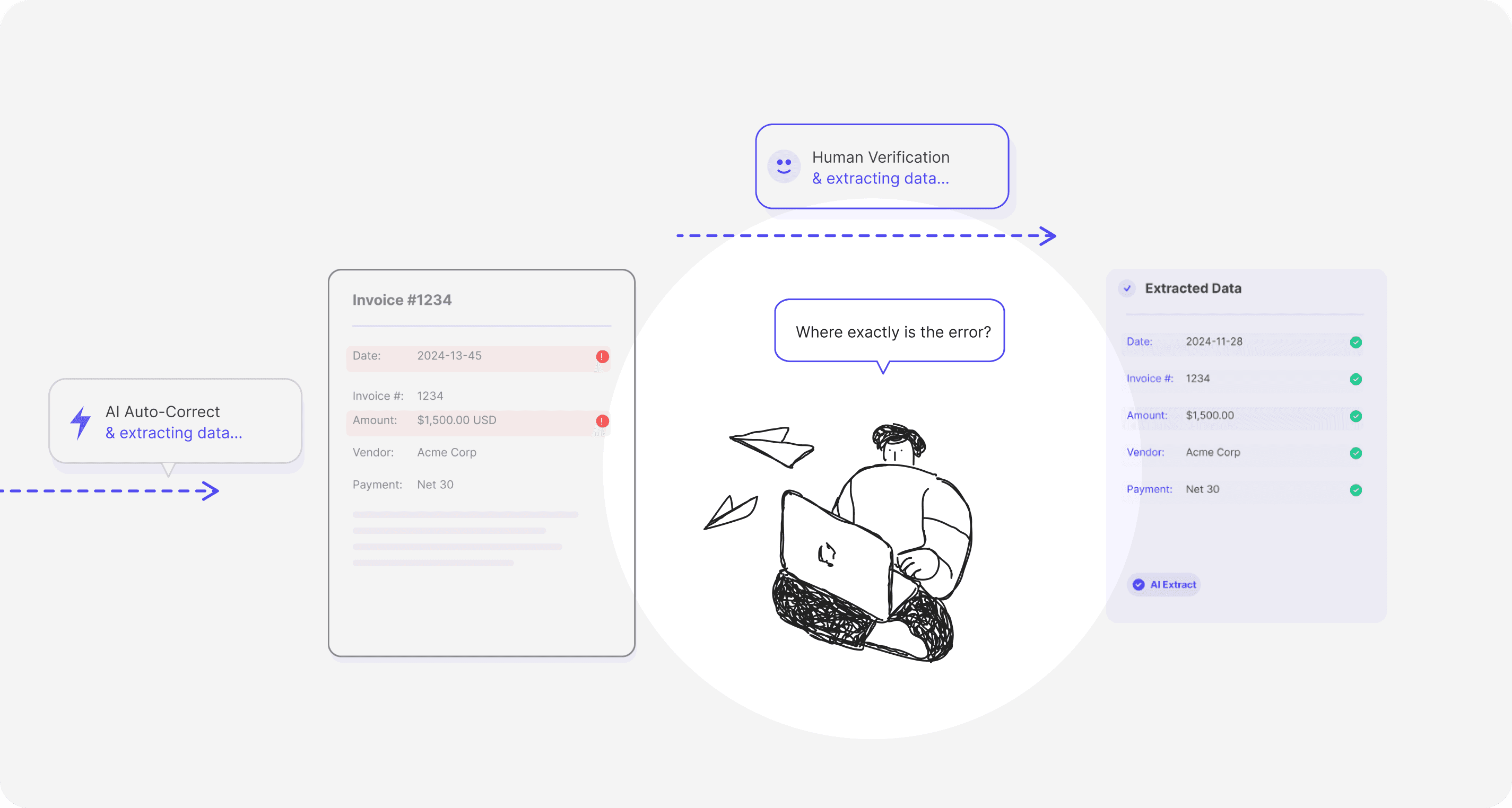 Reviewing AI-extracted invoice data was a slow, frustrating task. Operators constantly jumped between pages to find unmarked fields, causing delays and increasing the risk of errors.