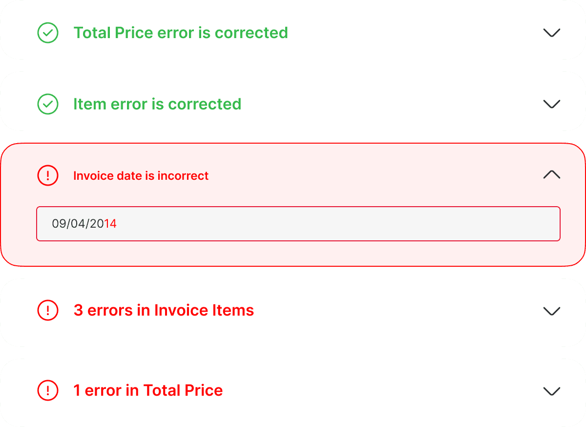 I organized the invoice data into collapsible, labeled sections (e.g., Invoice Details, Line Items). This eliminated the need to visually scan the entire document or correction form.